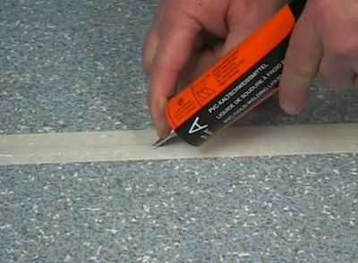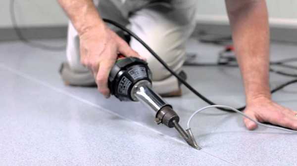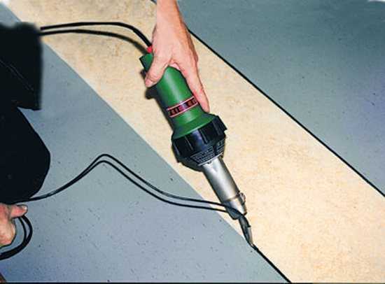 Обработка швов горячей сваркой проводится после того, как полотна линолеума приклеились к основанию. Для выполнения данной операции потребуется шнур, а также специальный инструмент, способный нагреваться до 400 градусов. По стыку полотен сначала прорезают паз для шнура. Затем его вставляют в сварочный пистолет, который позволяет быстро вставить шнур в проделанный ранее паз. Под действием высокой температуры шнур расплавляется и соединяет полотна линолеума между собой. После этого с еще горячего шва специальным ножом срезаются излишки. Когда остынет шов, его отшлифовывают. С помощью шнуров разного цвета можно внести изюминку в дизайн помещения.