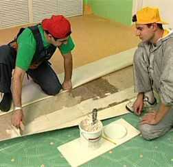 Для приклеивания к черновому бетонному полу подходят: Линолеумы с изоляционной подосновой. Тыльная сторона их оснащена тканой или нетканой подложкой, препятствующей прохождению тепла и звуковых волн. Алкидные линолеумы. Иначе глифталевый вид покрытия. Изготавливается с основой из тканого или нетканого полотна. Наклеивать можно и бытовые, и коммерческие марки линолеума. Чаще так поступают со вторыми, потому что первые можно вообще не фиксировать клеем. Безосновные марки линолеума не могут приклеиваться непосредственно к бетонной черновой основе. Для их укладки на бетонный пол требуется предварительное устройство слоя сухого выравнивания из фанеры, ДВП, ДСП и подобных материалов. Плиты ОСП пригодны к применению в качестве сухой стяжки под линолеум, если толщина укладываемого покрытия больше 4 мм. В приклеивании линолеума используются: Дисперсионные составы. К ним относятся всем известный Бустилат, АДМ-К, АК, Гумилакс и их зарубежные аналоги. Применяются для фиксации линолеумов на изоляционных подложках и тканевой подоснове. Приклеивание выполняют сразу после нанесения дисперсионной клеевой системы слоем в 6 – 7 мм на бетонное основание. Битумные мастики и клеи. В их числе «Биски», отечественные и зарубежные битумно-полимерные составы. Используют при приклеивании линолеумов с тканевой подосновой. Приклеивание производится спустя 15 – 20 минут после нанесения слоем 4 – 5 мм. Мастики на основе синтетических каучуков и смол. Это различные вариации масляно-меловых, лаково-меловых, битумно-меловых, козеиново-цементных систем, такие как КН-2, КН-3, «Перминид». Применяют для приклеивания ПВХ и алкидных линолеумов без подложек. Наносят слоем в 3 – 4 мм. Мастики, созданные на основе искусственных смол и каучуков, наносят на основание и на тыльную сторону напольного покрытия шпателем или вовсе кистью. На этот клей линолеум приклеивают не сразу, а дождавшись «отлипа» — т.е. самопроизвольного выветривания излишка растворителя из состава, нанесенного на черновой пол. Только потом слоем мастики в 2-3 мм покрывают тыльную сторону материала, а спустя 10 — 15 минут уже наклеивают. Первые две из указанных разновидностей клеевых систем наносят на черновое основание пластиковыми, металлическими или зубчатыми шпателями. Размер зубьев определен требующейся толщиной наносимого слоя. При нанесении мастик с синтетической основой нельзя пользоваться металлическим шпателем из-за риска возгорания и вероятности взрыва при контакте с металлом. Излишки клея, выступившие в швах после наклейки, необходимо сразу убрать ветошью. Попавшие на руки мастики удаляют подходящим растворителем, дисперсионные клеи запросто смываются водой. В зависимости от габаритов помещения производится наклеивание по всей площади, по периметру или только по стыковым швам, если они есть. Стыки проклеиваются «Перминидом» или ТГФ-70М. В комнатах до 20 м² полное приклеивание необязательно. В жилых помещениях вообще лучше воспользоваться двухсторонним скотчем, расположив его исключительно по периметру.