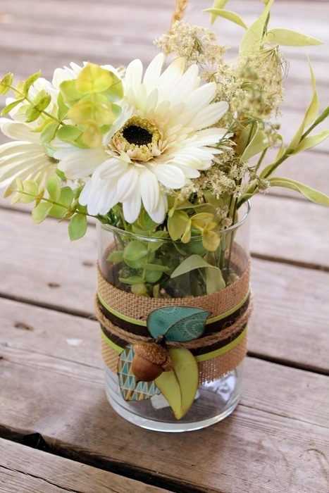 Симпатичное решение облагородить обычную прозрачную вазу при помощи мешковины и аксессуаров.