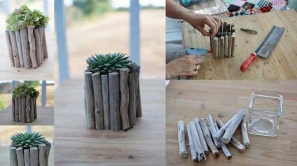 Еще один вариант вазы из палок и прутиков без использования шпагата. Ветки крепим друг за другом жидкими гвоздями прямо к баночке.