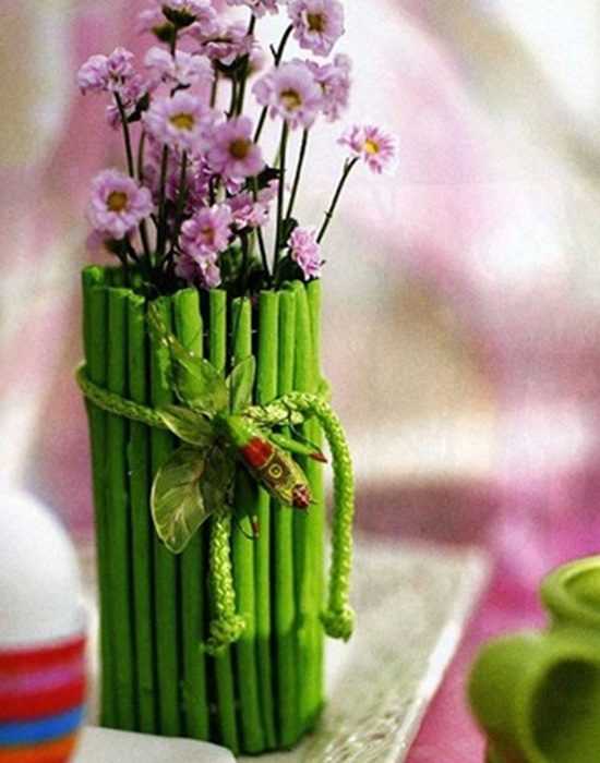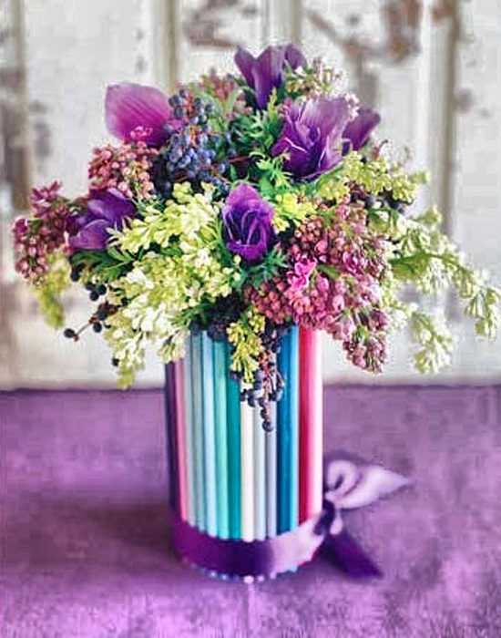 Оригинальный вариант декорировать вазу при помощи обычных цветных карандашей, что станет находкой для любого интерьера.