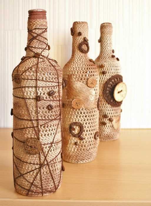 Хорошенькая идея украсить обычные бутылки при помощи нити, что станет просто открытием и позволит создать оригинальные вазы.