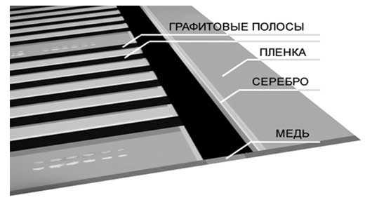 В более дорогих видах пленки эта паста может наноситься сплошным равномерным слоем. Ток протекает по тонким медно-серебряным проводникам. Рабочие элементы этой нагревательной системы запаяны в два слоя плотной пленки.