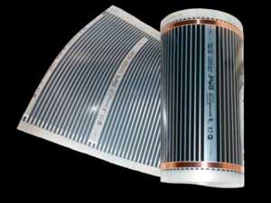 Принцип работы данного образца идентичен работе нагревающегося электрического кабеля. Стоит отметить, что вместо жил внутри этой пленки расположены металлические полосы. Они плотно запаяны внутрь нескольких слоев пленки из полимеров. Эти полосы расположены на минимальном расстоянии в 1 мм друг от друга — это создает иллюзию того, что пленка похожа на однородный металл. Подводящие электрические провода расположены на боку. Пленка состоит из отдельных блоков, тепло по которым по очереди передается с применением способа конвекции.