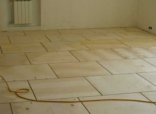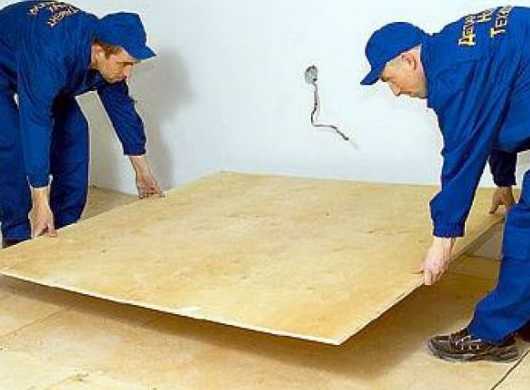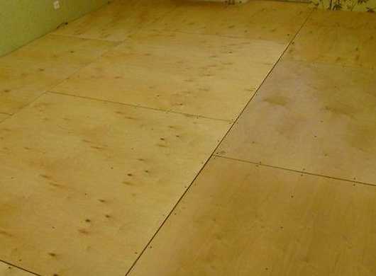Можно продублировать фанерный слой поверх уже существующей подложки из фанеры. Либо, разрезав листовой материал на четверти, можно закрепить его саморезами к предварительно выровненным половицам.
