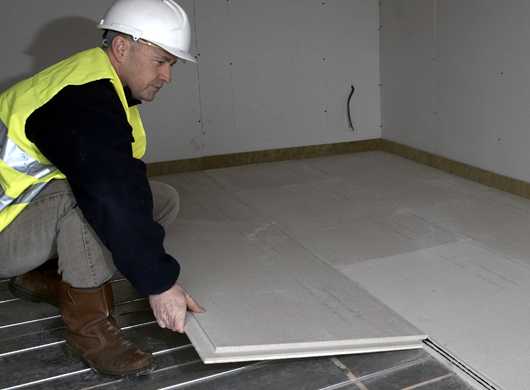 Можно воспользоваться и таким методом, как прикрепление к полу ГКЛ с применением эластичного полиуретанового клеящего вещества. Его структура не нарушится при переменах в основании. Если необходимо увеличить жесткость пола, ГКЛ укладывают двойным слоем так, чтобы стыки верхнего и нижнего рядов не совпадали.