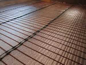 Если предполагается использовать керамогранит либо керамическую плитку, следует отдать предпочтение стержневой конструкции. Для повышения эффективности обогрева на стяжку можно постелить отражающий экран.