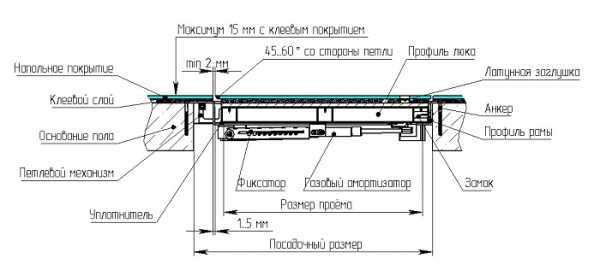Крышка люка легко открывается и фиксируется вертикально в открытом положении, благодаря газовым упорам, данный механизм запатентован. Монтируется заподлицо с полом, на крышку укладывается отделочный материал, напольное покрытие нигде не прерывается. Удобный замок.