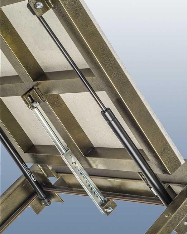 Для чего это нужно? Во-первых, достигаем оптимальной удаленности вакуумных стоек от петель при креплении к раме. Чем ближе к петлевой стороне стоит шток амортизатора, тем меньше КПД работы на подъем и больше усилие газлифта на сопротивлении опусканию дверцы. Во-вторых, обеспечиваем равновесное положение штоков в цилиндрах на закрытой створке.Как установить газовые амортизаторы на люк в подвал