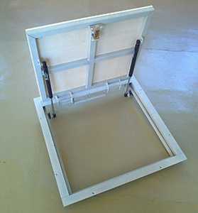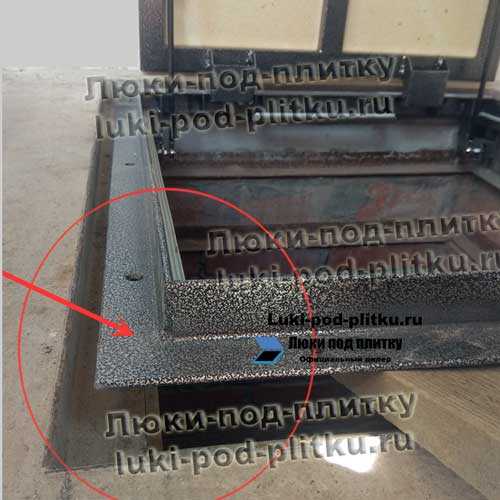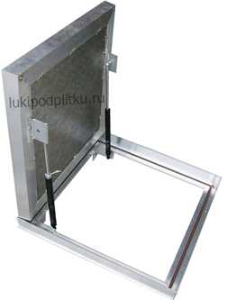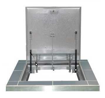 Стальные напольные люки под плитку с амортизаторами выдерживают большие нагрузки, т.к. рама люка сделана из прочного металла. Жесткий каркас на дверце дополнительно защищает проем. Люк снабжен замком-защелкой и ручкой для его открывания. Газовые амортизаторы помогают открыть дверцу на 90 градусов. Люк вставляется в проем и фиксируется с верхней стороны в пол, плитка приклеивается на дверцу, создавая полностью невидимый проем.