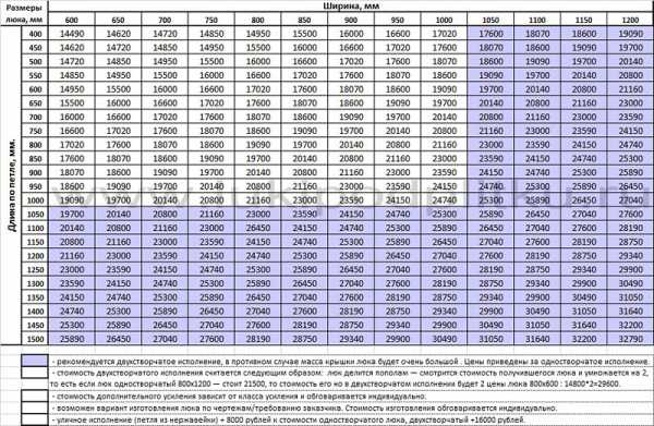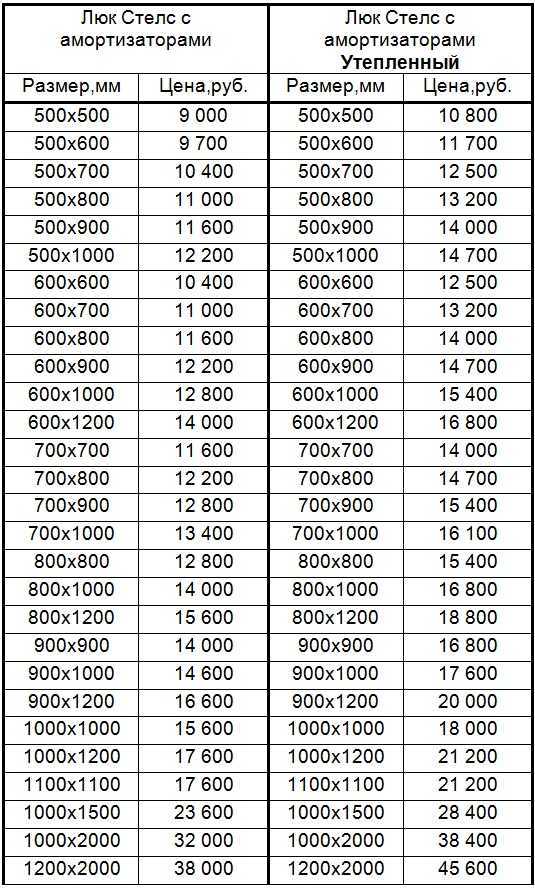 Компания Материал Размеры, мм Цена, руб Revizor Алюминий, сталь оцинкованная 600 х 600 9 660 700 х 800 14 350 900 х 900 14 230 1100 х 1100 18 440 ООО Дива Сталь, с порошковой покраской 600 х 600 6 600 700 х 700 8 550 800 х 600 8 550 900 х 700 9 450 900 х 900 10 350 1200 х 800 11 550 Проектно-производственная компания Практика Стальной окрашенный профиль 692 х 692 9 950 692 х 992 11 100 792 х 792 10 600 892 х 892 11 300 992 х 992 11 950 Люк в подвал с амортизаторами: чертежи и размеры, цена, виедо