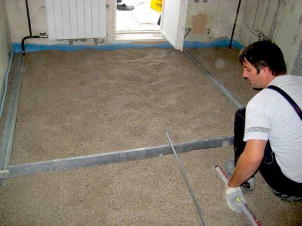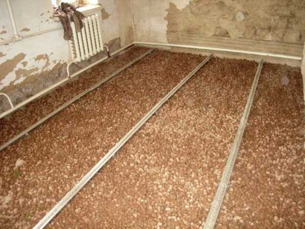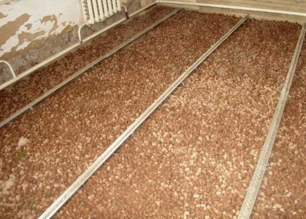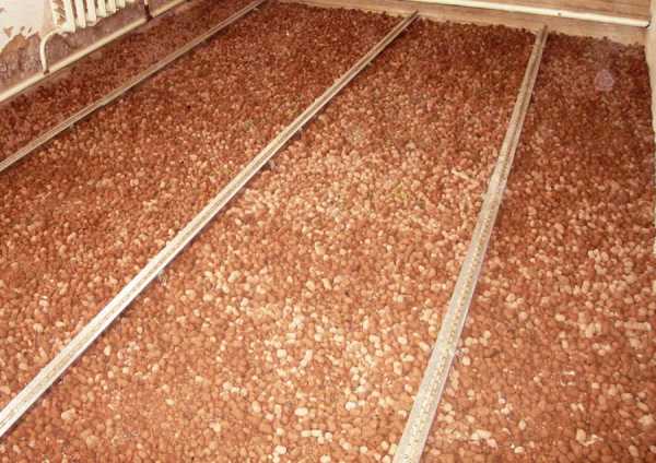 При первом типе выравнивания последовательность действий довольно простая. После того как основание будет подготовлено, а маячки установлены, на основание следует высыпать слой керамзита. Его следует разровнять, чтобы от основания до поверхности слоя было 2,5 см.