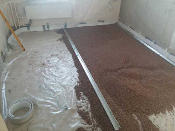 Когда слой гидроизоляции будет готов, можно выставлять маяки. Кстати, для гидроизоляции можно использовать и полиэтиленовую пленку. Главное сделать внахлест стыки между полотнами (минимум с заходом в десять сантиметров) и проклеить влагостойким («серебряным»)скотчем. Керамзит выкладывают поверх пленки.