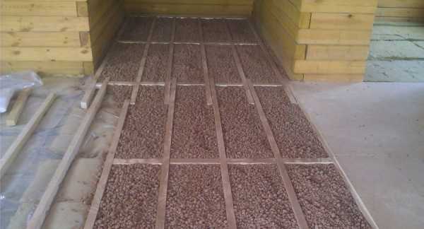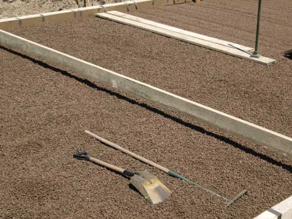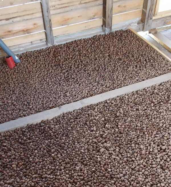 Промежутки между каркасными распорками засыпаются керамзитом. Его слой не должен доходить до верхнего уровня маяков примерно на два сантиметра. Этот зазор уйдет на устройство бетонного покрытия. С помощью правила нужно тщательно выровнять заполнитель от дальней стены к выходу.
