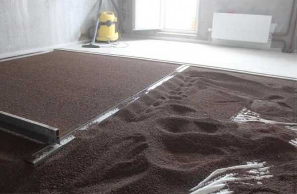 Как только раствор будет перемешан, керамзит приобретет серый цвет. Также он будет мокрым. Раствор должен получиться без комков, максимально однородным. При помощи установленный маячков основание делится на участки.