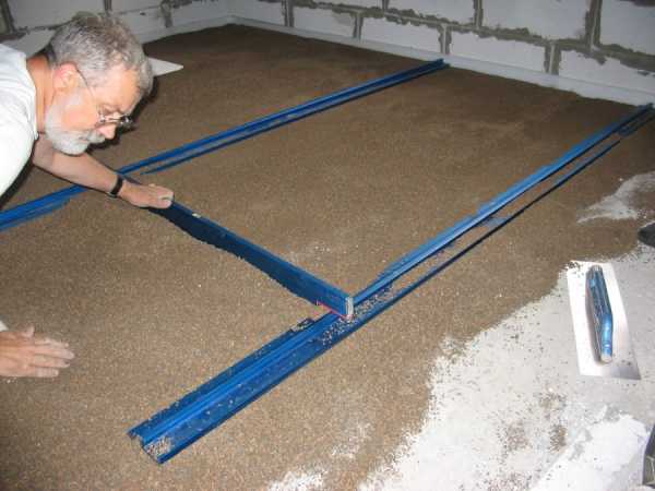 Чтобы заливаемый слой был ровным, используйте маяки. Располагайте их на расстоянии 15,0 сантиметров друг от друга. Монтировать начальную направляющую следует, отступив от стены на сантиметров 25,0-30,0. Чтобы маяки зафиксировать, используют обычно саморезы. Их нужно ввернуть в керамзитобетон. Шурупы позволят вам отрегулировать высоту планки как нужно.