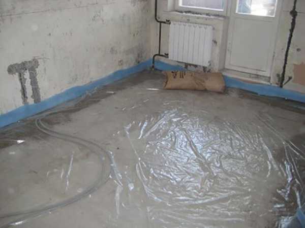Края гидроизоляционного материала необходимо завести на стены выше предполагаемой стяжки на 20 см. После того как финишное выравнивание пола будет выполнено, лишнюю пленку нужно обрезать.