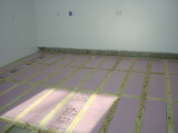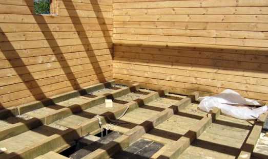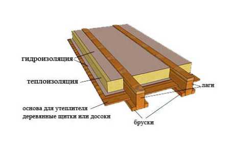 Поверхность столбиков покрывается рубероидом или антисептированными прокладками толщиной около 30 мм из обрезков досок. Лаги устанавливают на столбики. К лагам прибиваются черепные бруски, на которые укладывается деревянный настил, служащий основанием «черной» поверхности. На настил, в образованные пространства, закладывают утеплитель, стекловату, минеральную вату или полистирол, и покрывают пароизоляционной пленкой.