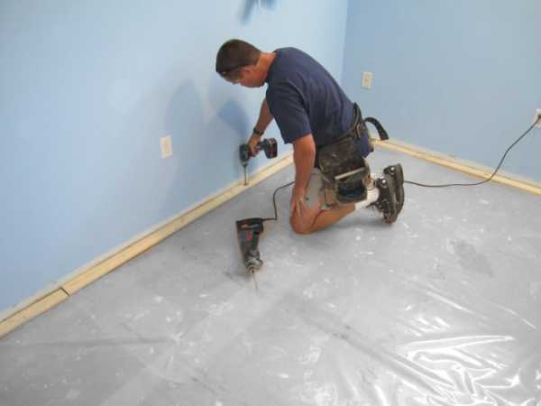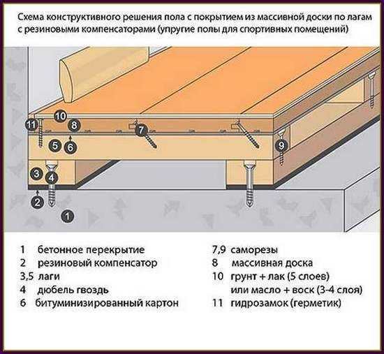 Перед началом работ на бетонные основания укладывается гидроизоляционный материал. Сверху прикрепляют, примерно через 1 м, деревянные лаги. Доски должны иметь длину около 2 м, толщину от 20 до 30 мм и ширину от 80 до 100 мм. Если возникнет необходимость стыковки, в лагах вырубают пазы для прочности соединения. Стыки лаг смежных рядов необходимо смещать по отношению друг к другу не менее чем на 50 см.
