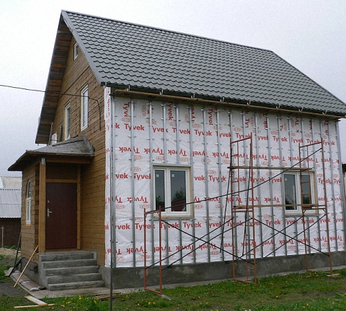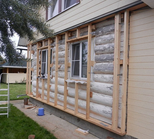 Непосредственно к деревянному дому лучше установить обрешетку выполненную также из дерева. Толщина реек для сооружения каркаса должна быть приблизительно 600х400 мм, а остаточная влажность - 16-20%. Кроме того, рейки предварительно обрабатывают с помощью антисептического раствора и просушивают.