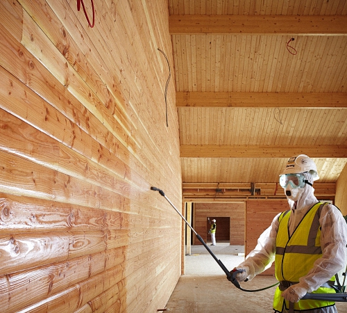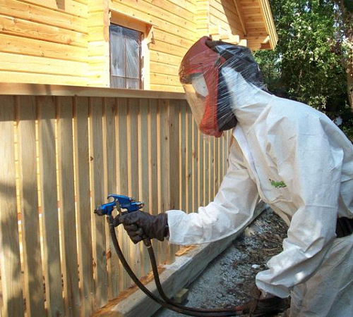 Работы по улучшению огнестойкости строения проводятся либо опрыскиванием деревянных поверхностей, либо нанесением составов кистью. Необходимо добавить, что обработка древесины вне помещений должна проводиться только в теплый сезон, так как при отрицательных температурах находящаяся в толще древесины замерзшая влага мешает проникновению огнезащитного состава вглубь.