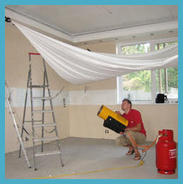 В начале с помощью тепловой пушки температуру в комнате поднимают до сорока градусов, плёнка ПВХ при этом становится более эластичной, и с ней уже намного удобней работать. Плёнку аккуратно, чтобы не повредить и не поцарапать разворачивают, и крепят по углам помещения разогревая плёнку терловой пушкой до температуры 60 — 65 градусов. Очень часто производитель потолка отмечает на плёнке базовый угол (при гарпунном варианте) — с него и начинают.